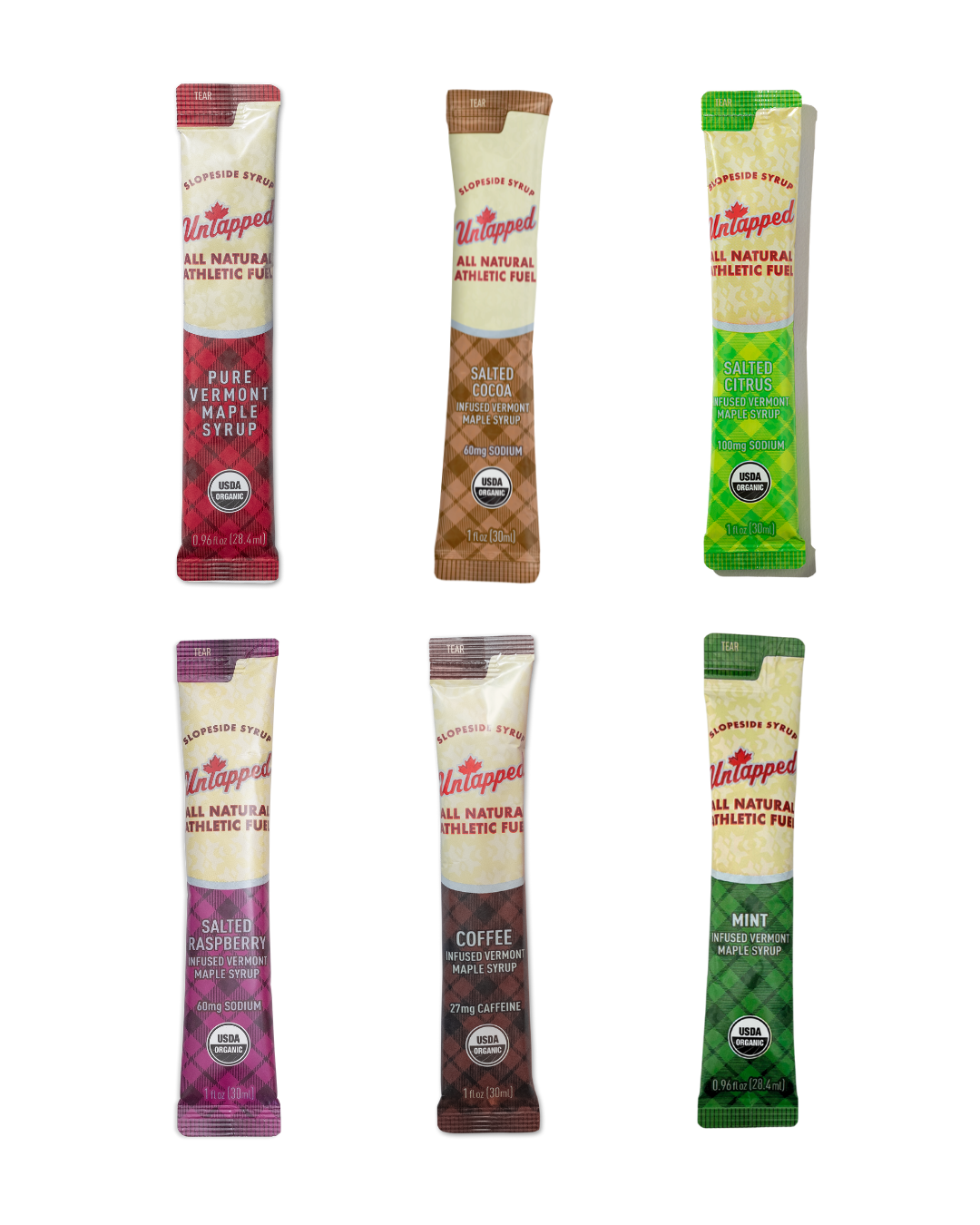 UnTapped’s are the foundation of the full line of maple-based nutrition we offer. Exclusively sweetened with 100 calories of Pure Vermont Maple Syrup, and no cut-rate carbohydrates like maltodextrin, which can be found in other energy gel offerings. UnTapped’s are the simplest conveniently packaged energy gel on the market. Using only real ingredients to provide better tasting, better digesting, better performing athletic nutrition. If you are interested in learning more, check out the Benefits of Maple, and our Fueling Guide.